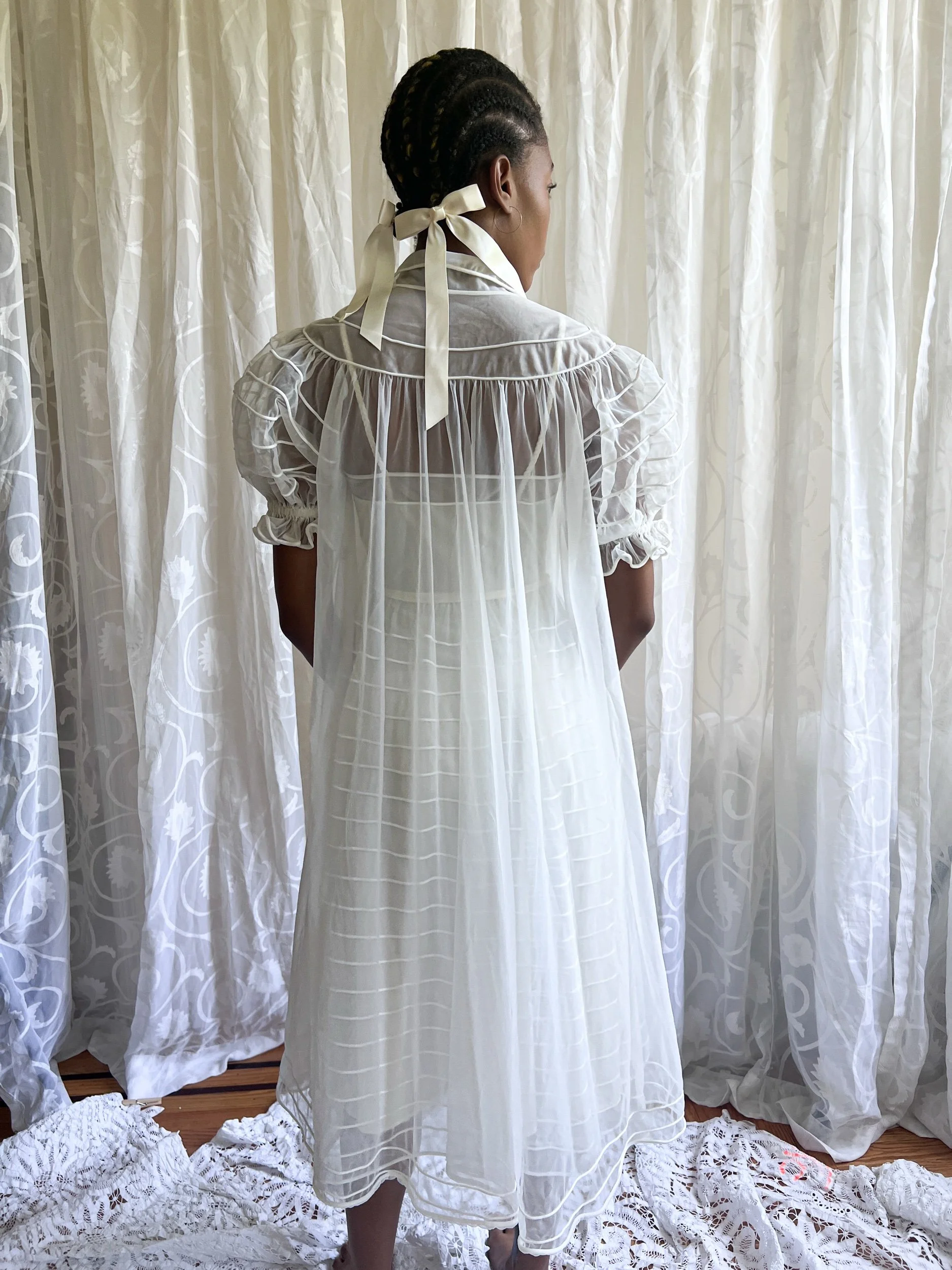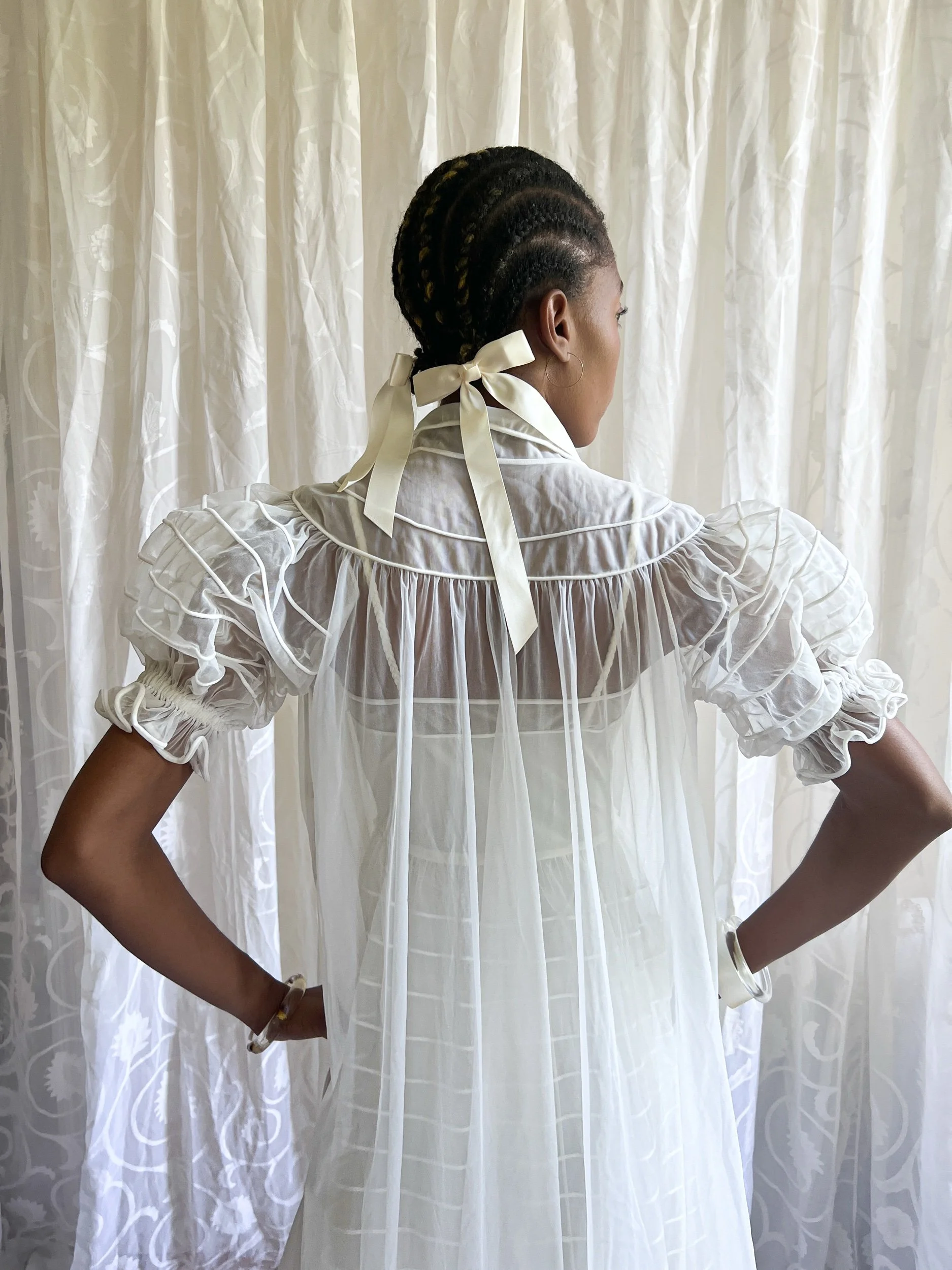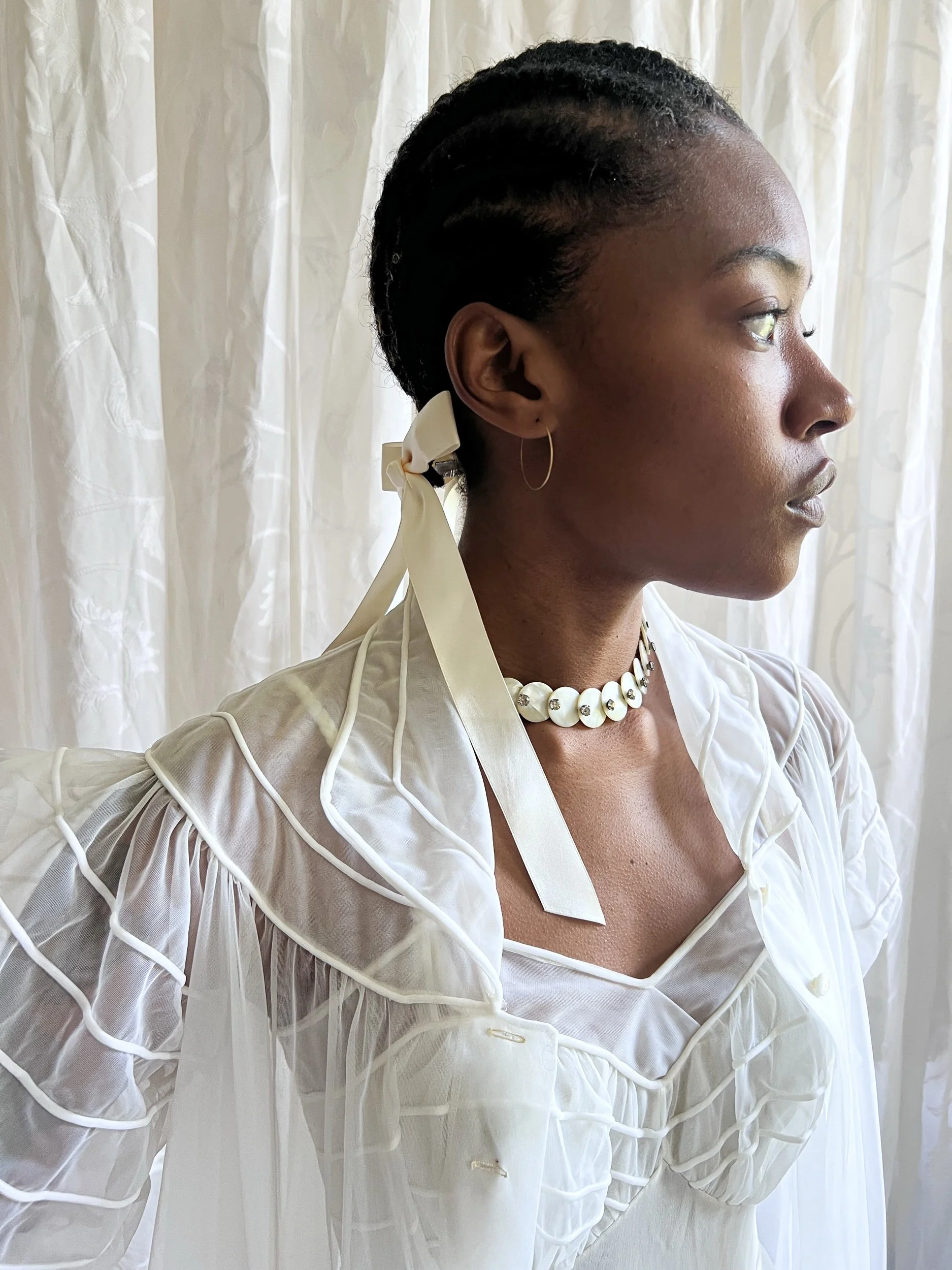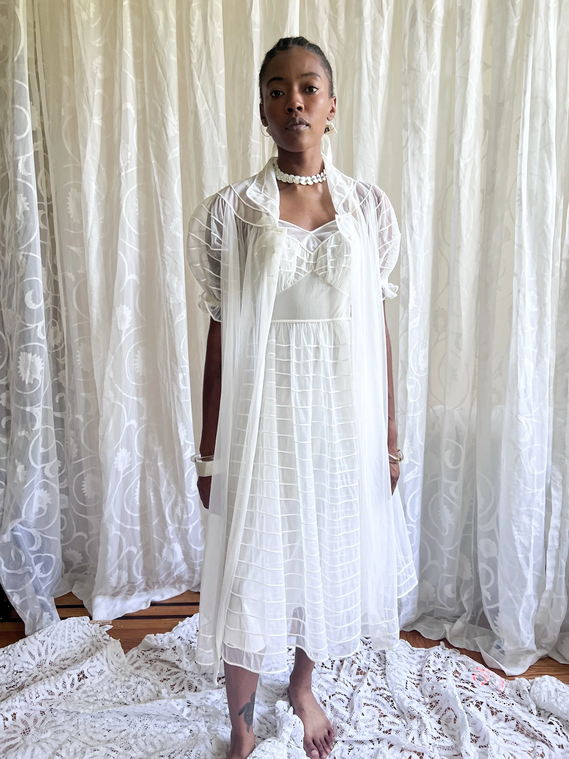 Description: 1930s white net puff shoulder dress…built in interior bodice with circle skirt…shirred detailing at sice…fluffy trim and embroidered flowers on shoulder and skirt…side zip.