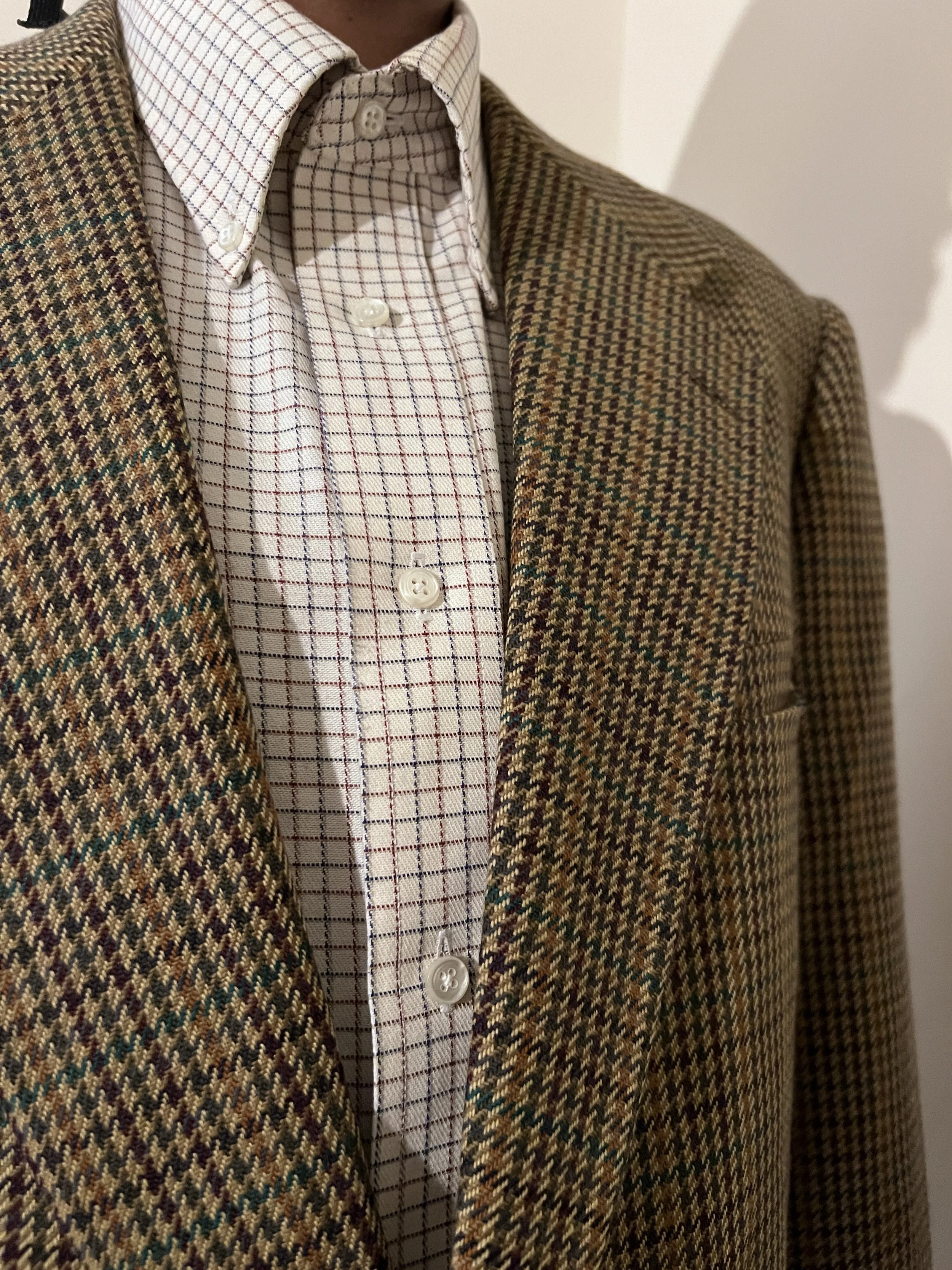 Description: 1970s textured stripe/print mix long sleeve button up with dagger collar. 50% cotton/ 50% polyester