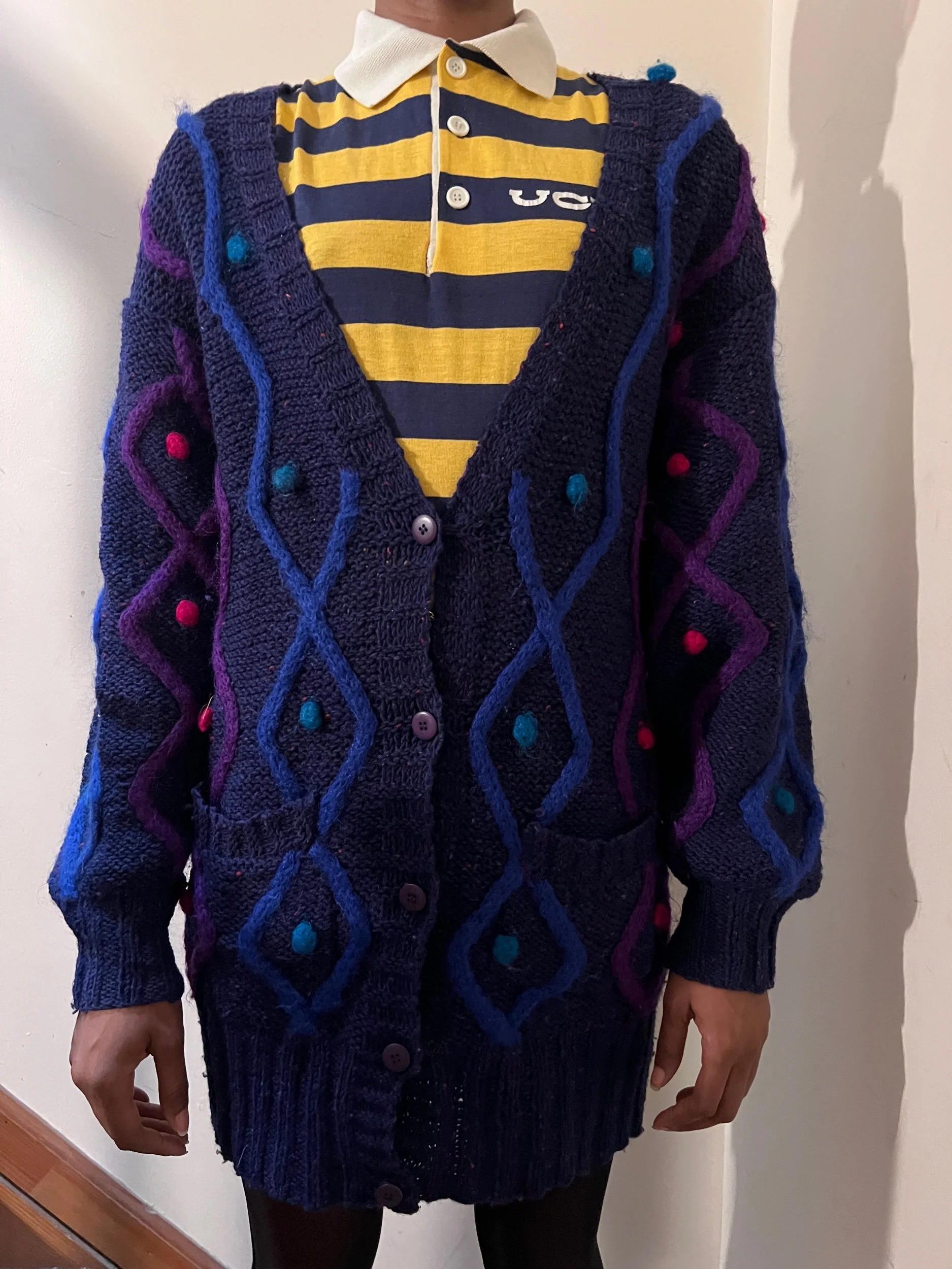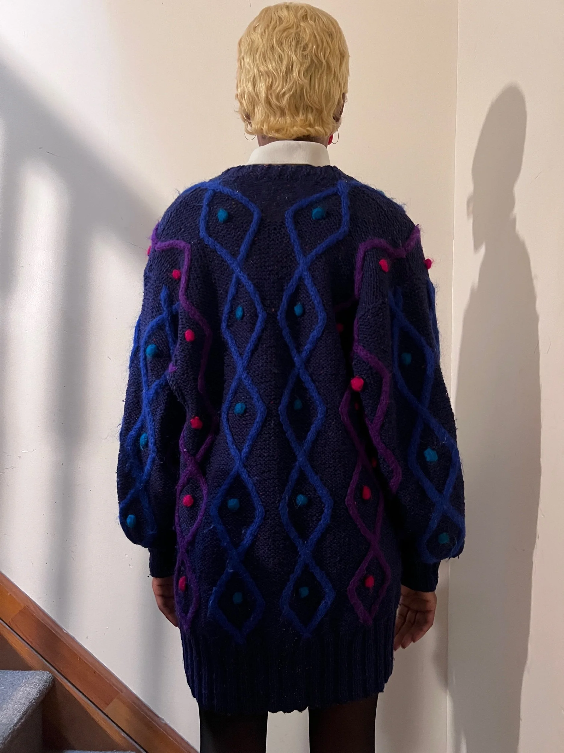 Description: 1980s navy marled 100% wool cardigan…3d diamond pattern interwoven into wool with fabric ball accents.