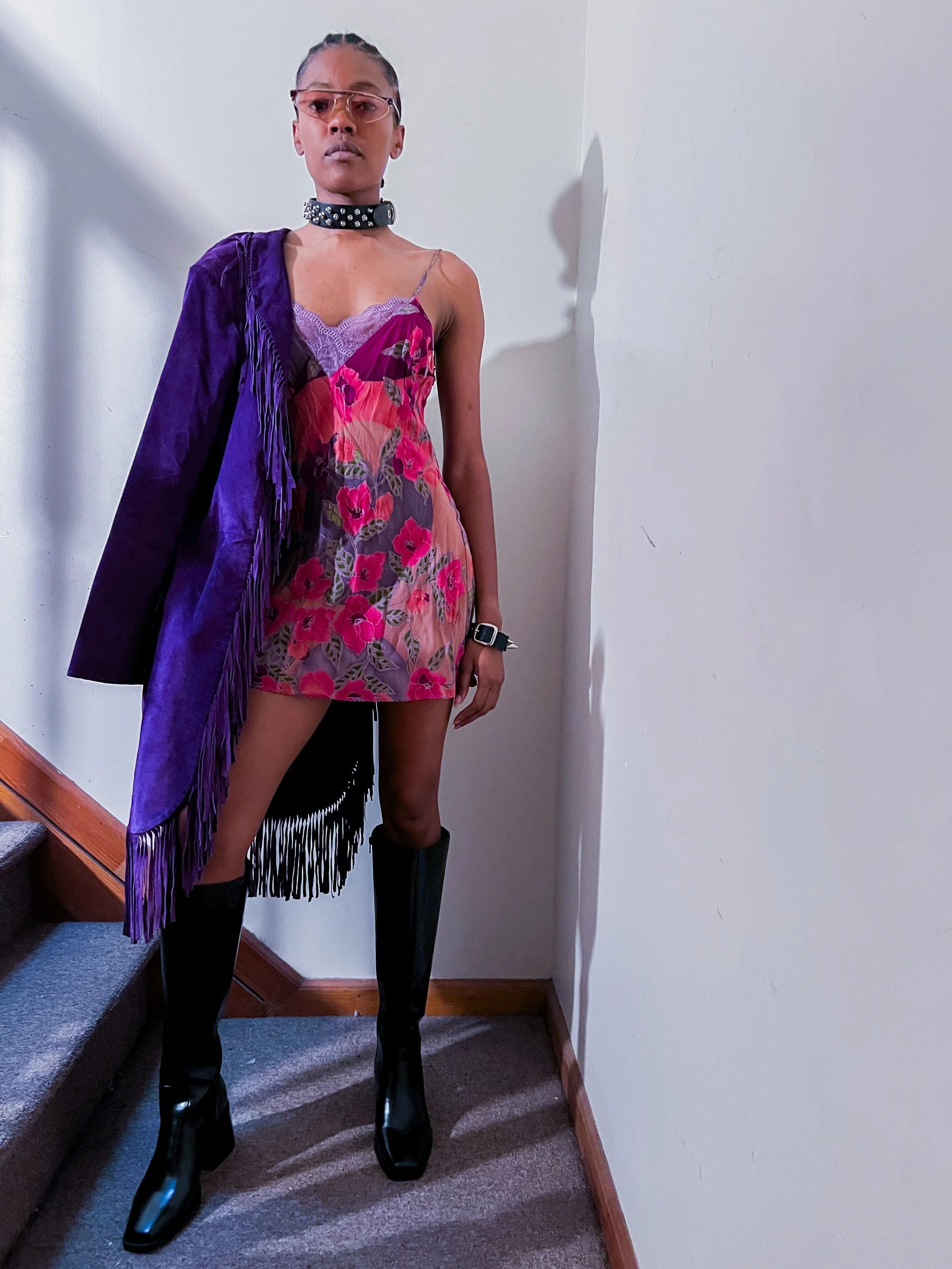 Description: 1990s purple suede ¾ length goat…shawl collar with fully tinged neckline to hem…side pockets…hook and eye closures… NOTE: dark discolorations on suede at on collar at top of neckline
