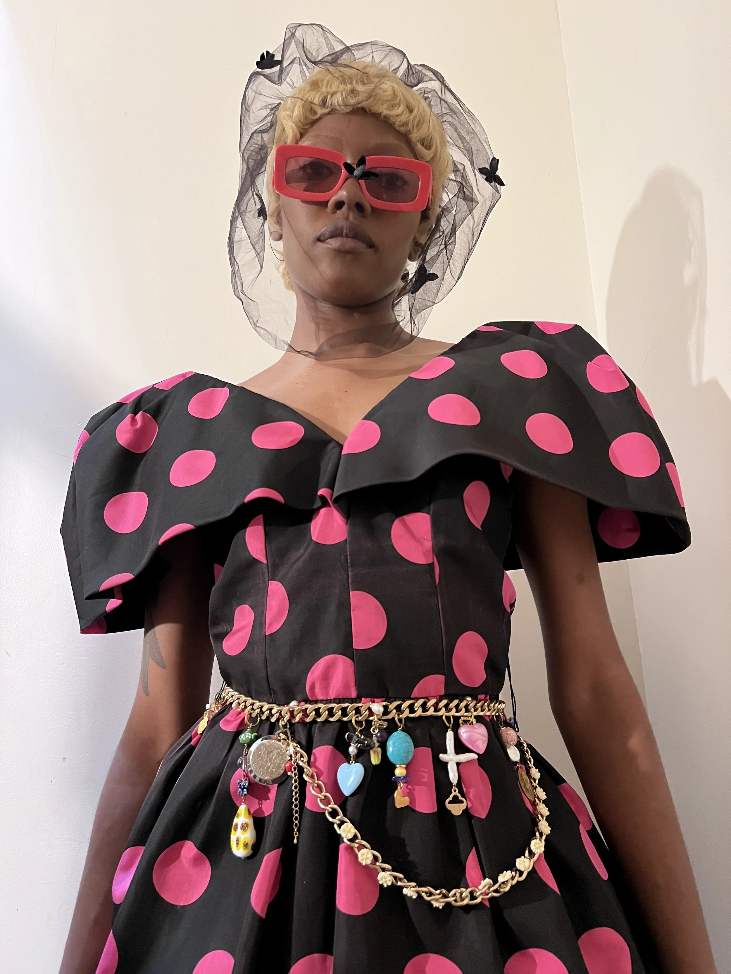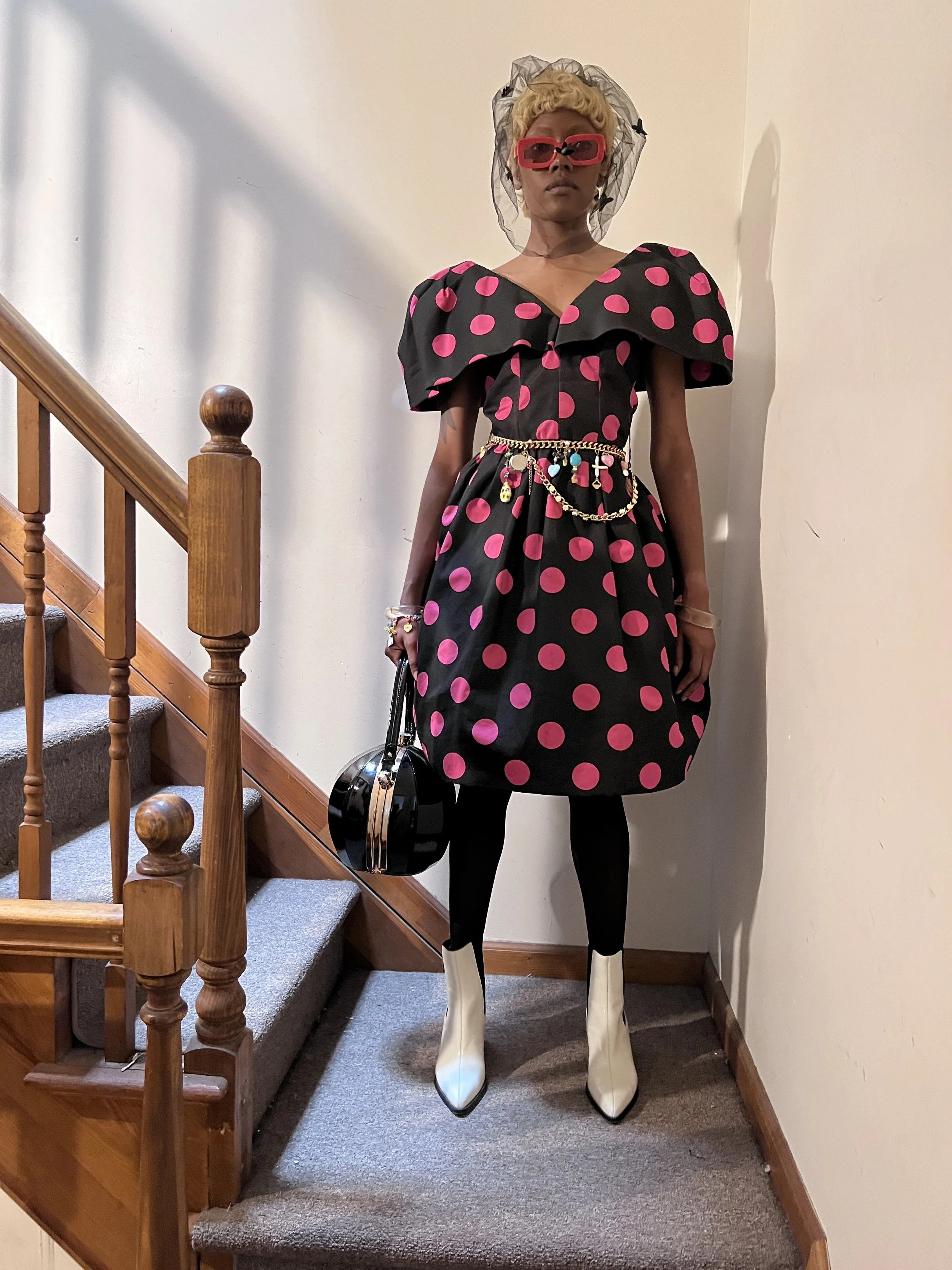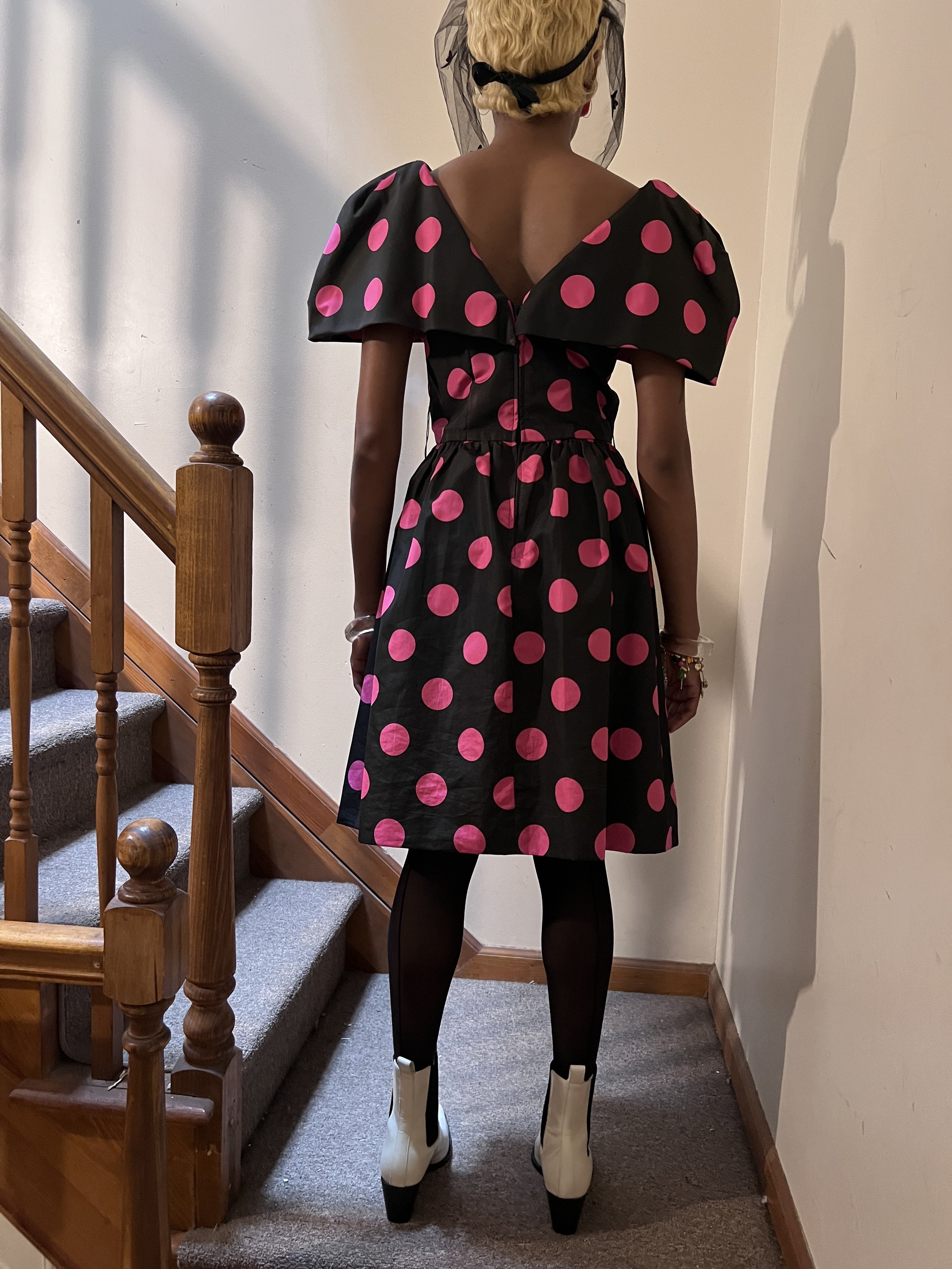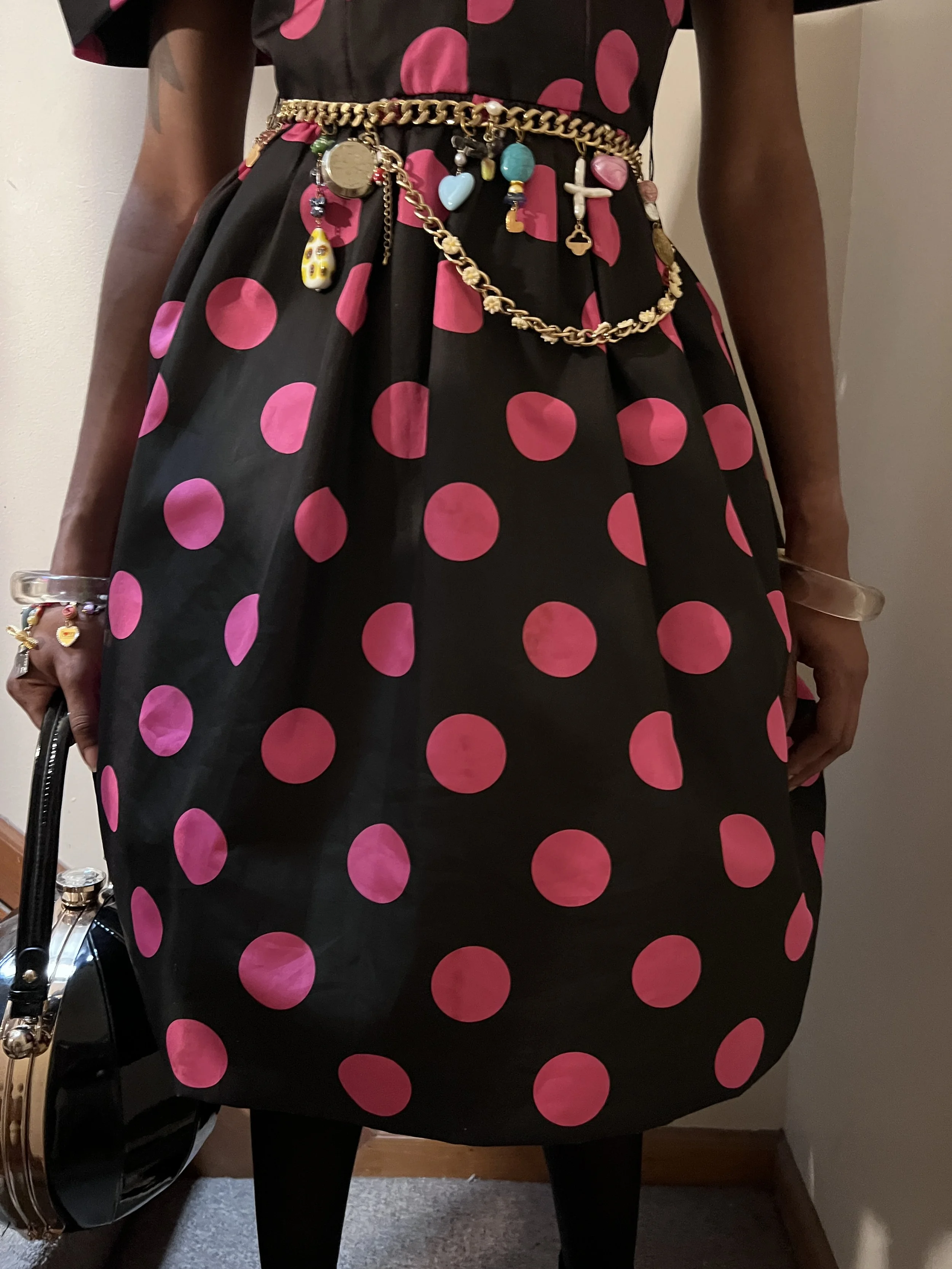 Description: 1980s multicolor geometric print strapless dress…100% silk…strapless with princess seams and boning at bust…drop waist and circle skirt cut…