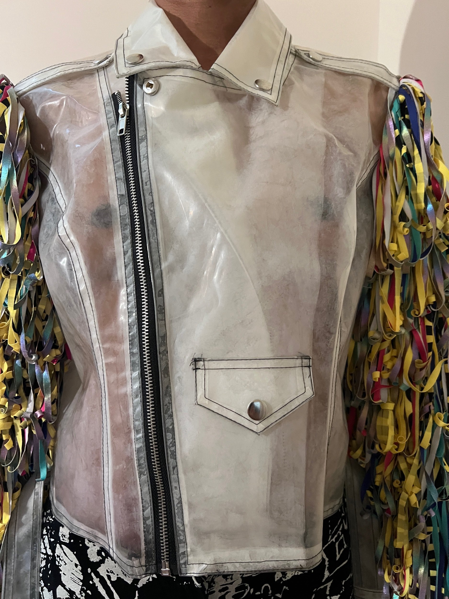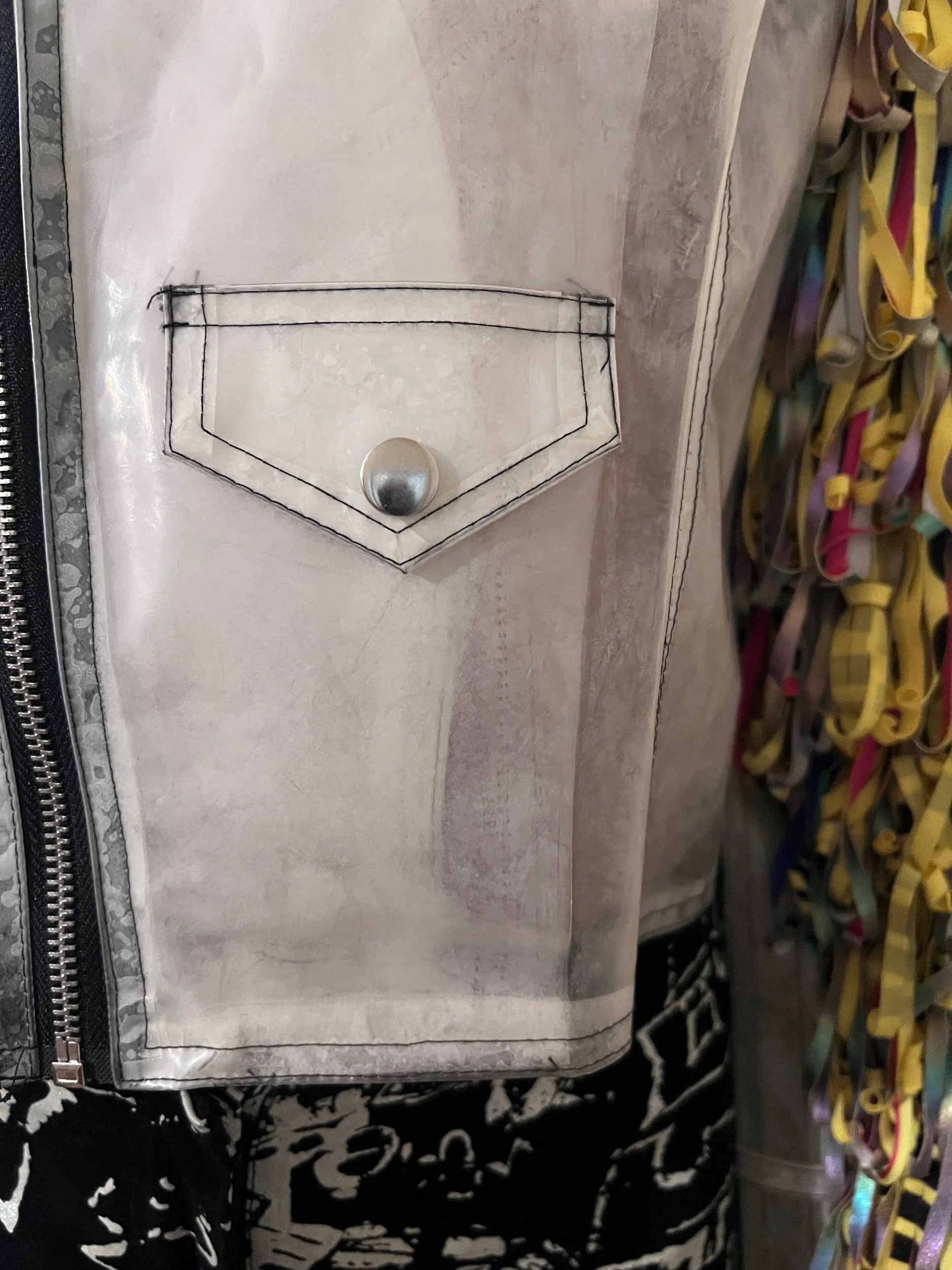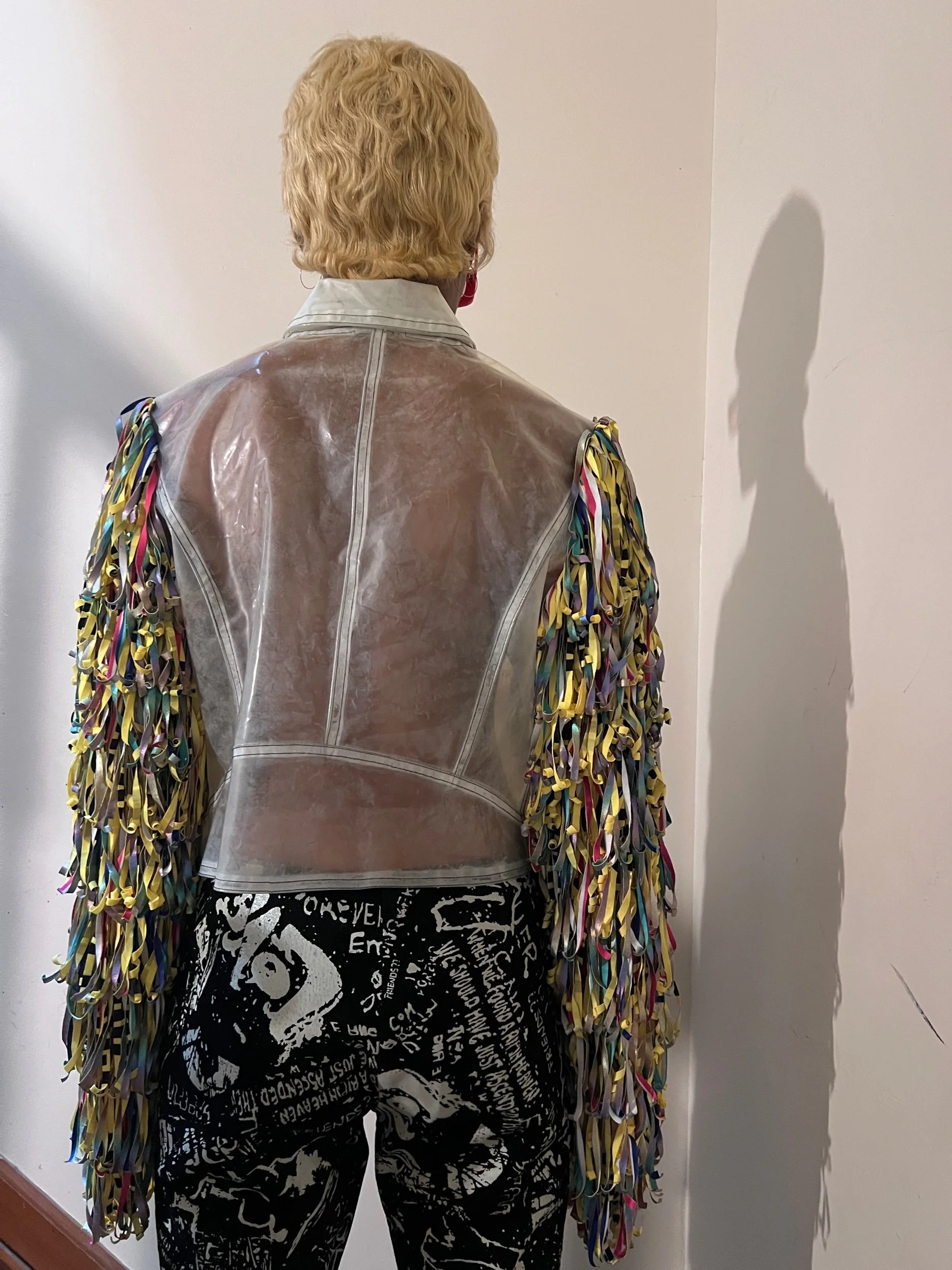 Description: 1990s clear PVC motorcycle jacket with multicolor spandex strips on arms…zip up with faux pocket