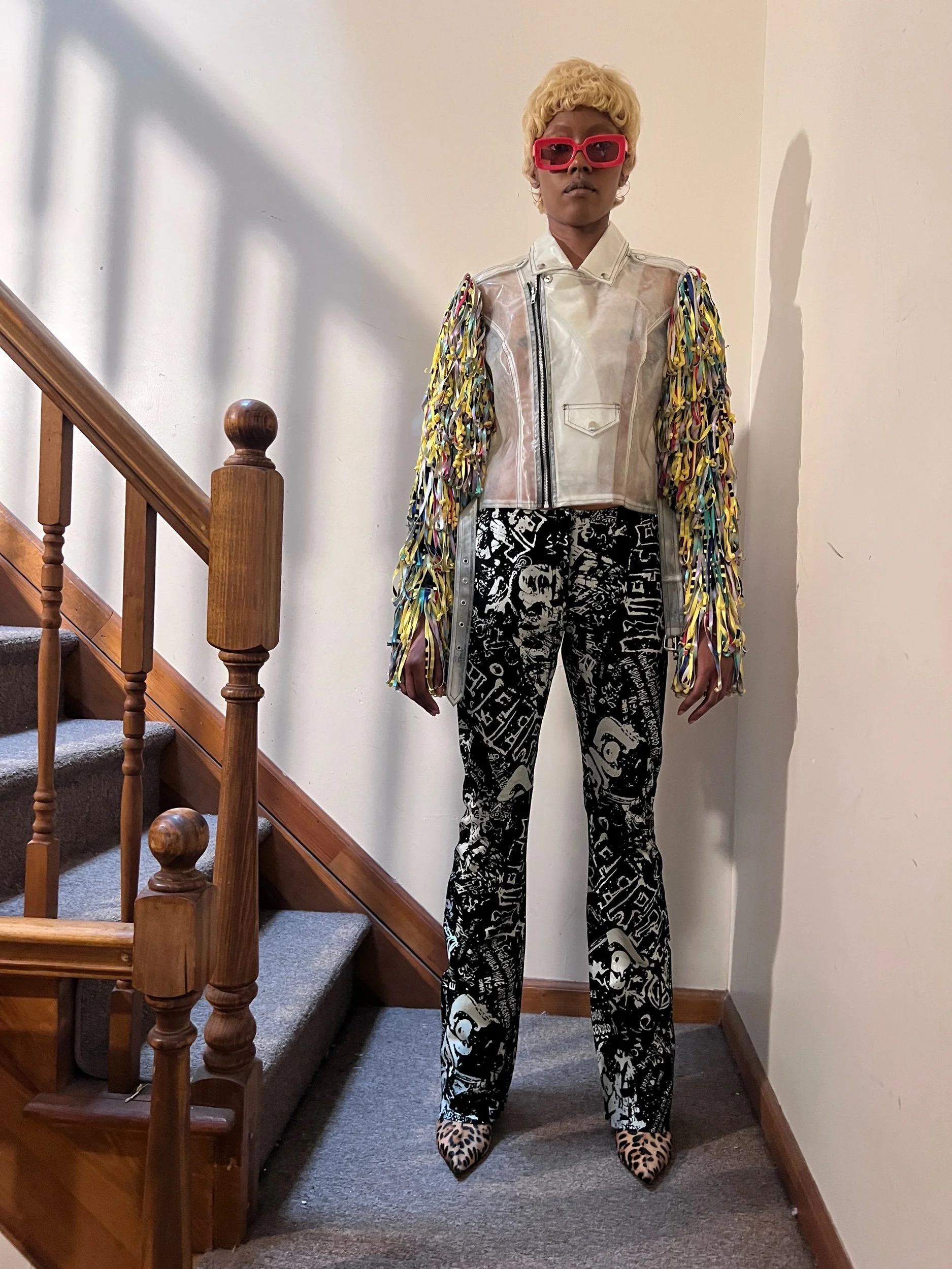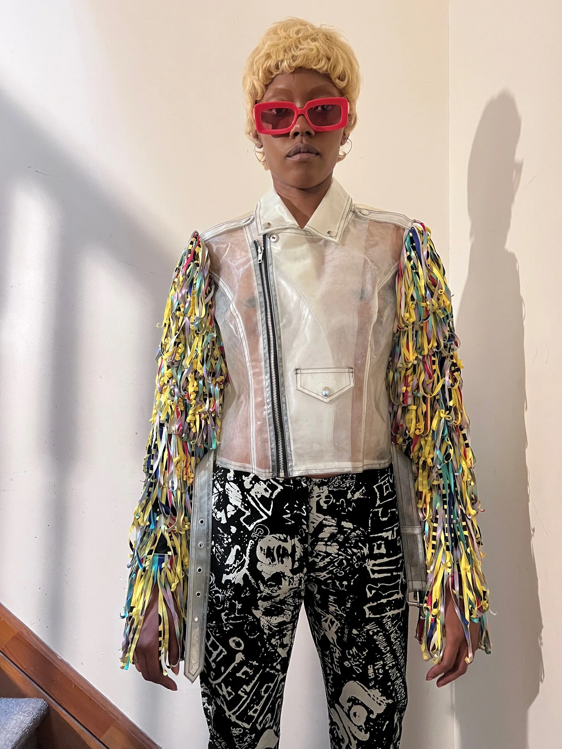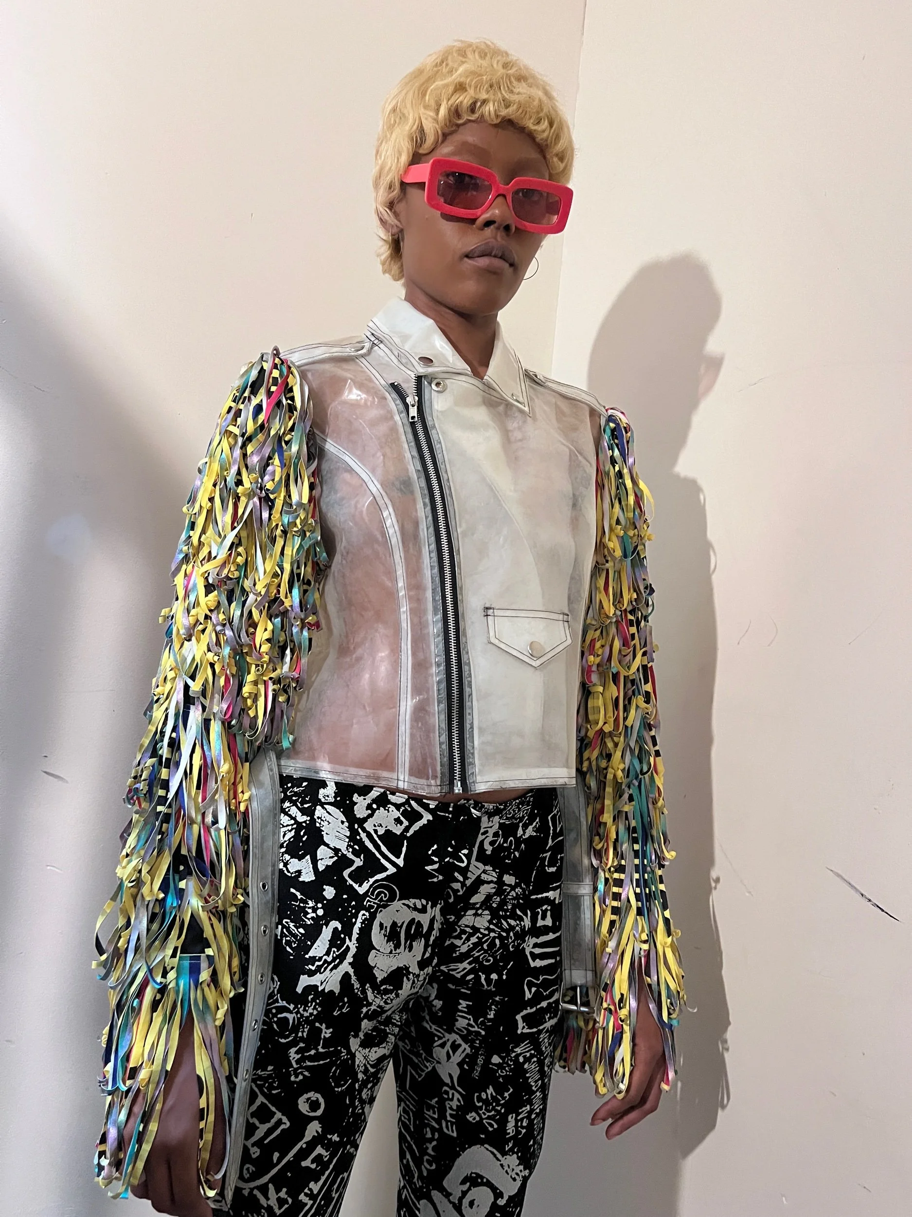 Description: 1990s clear PVC motorcycle jacket with multicolor spandex strips on arms…zip up with faux pocket