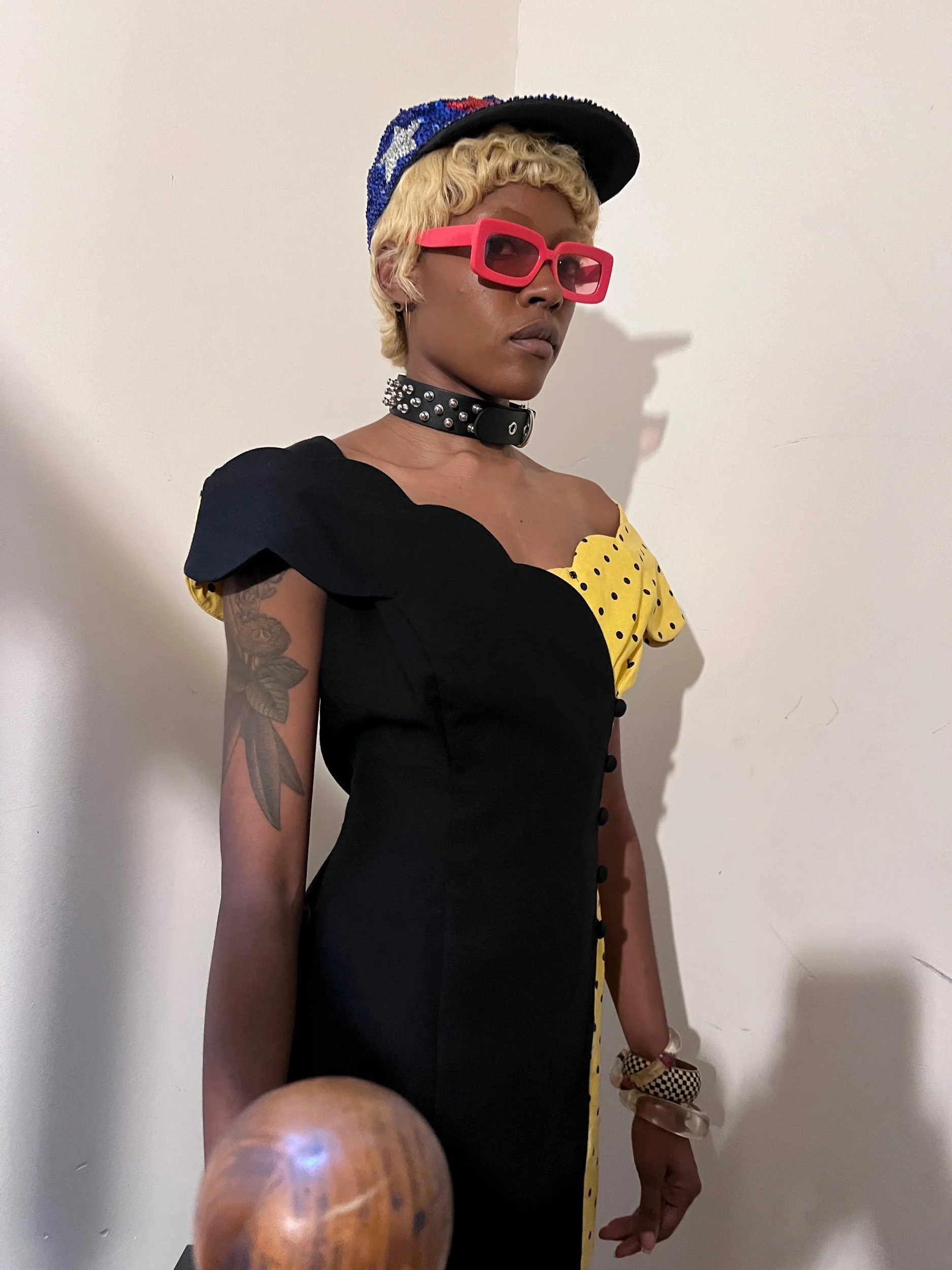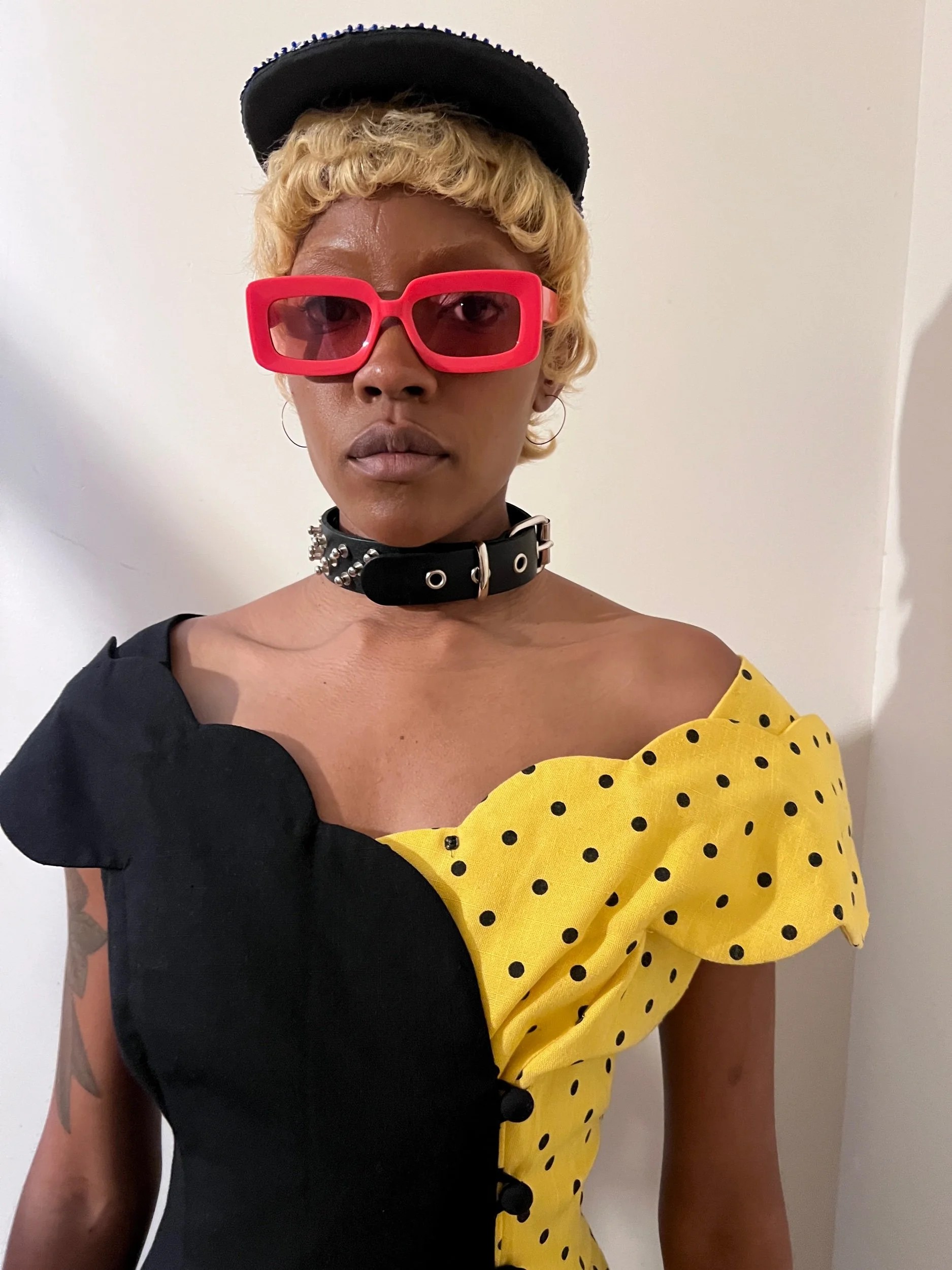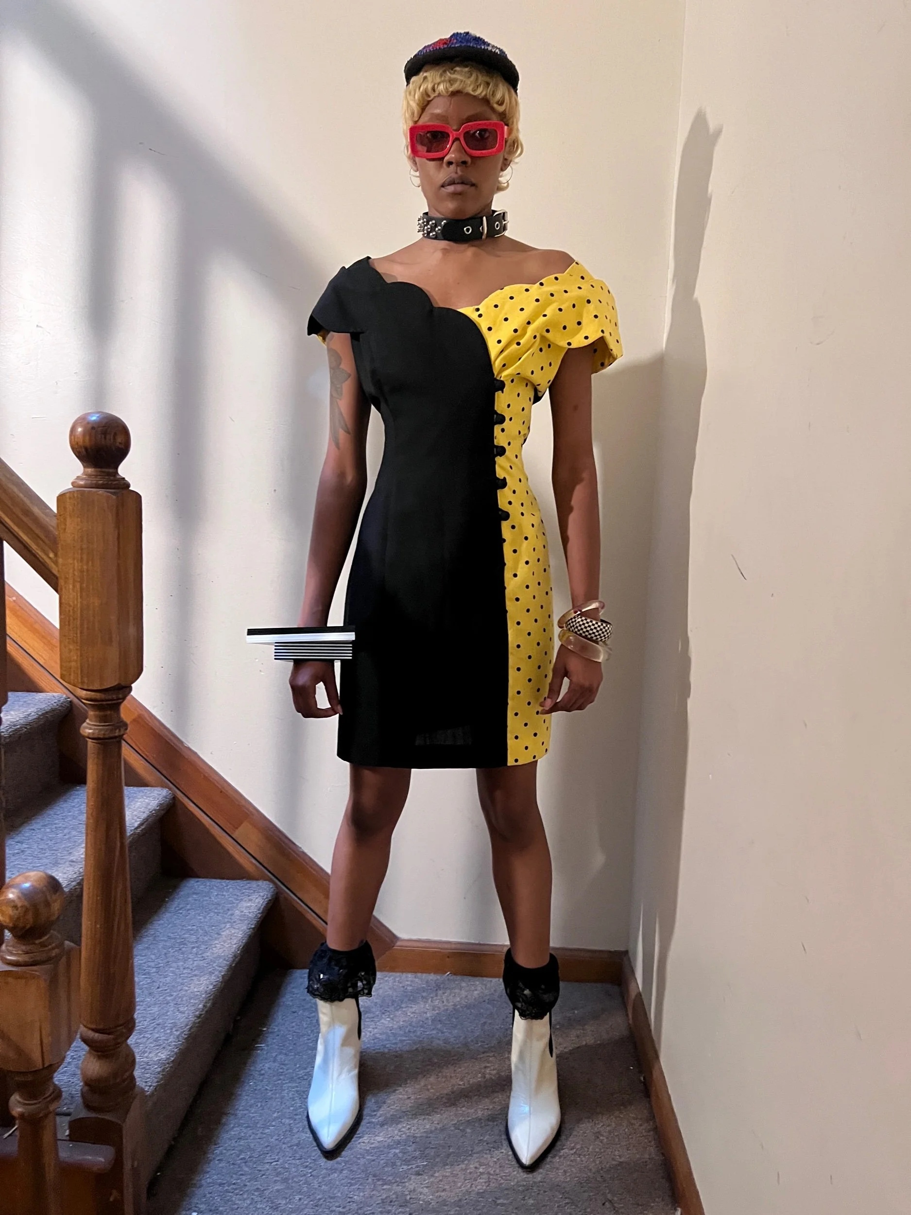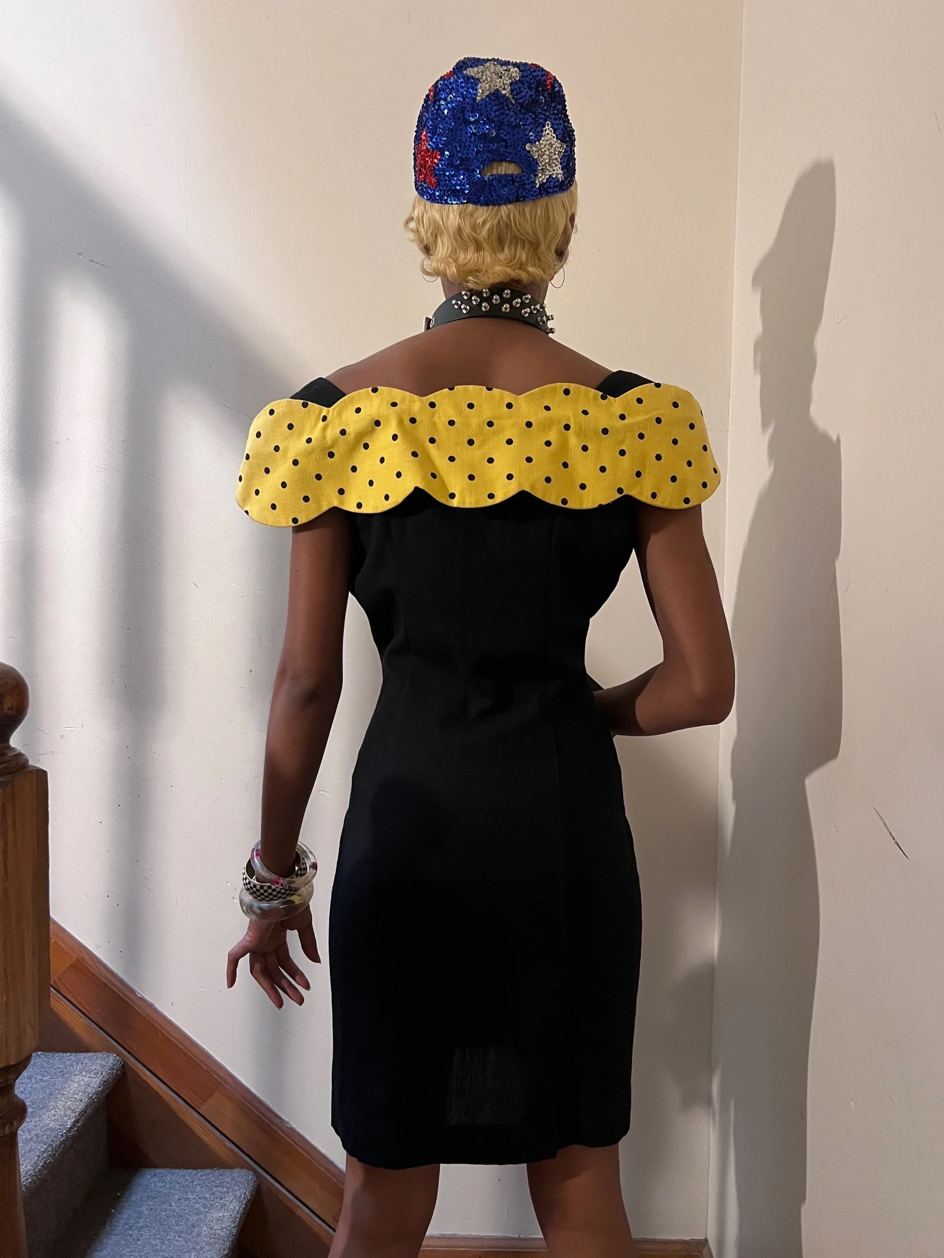 Description: 1980s black and green garden floral silk dress…layered silk pleating at bodice with wrap skirt styling…sweetheart neckline with thin spaghetti straps (can be worn with or without) zip up back…fully lined…